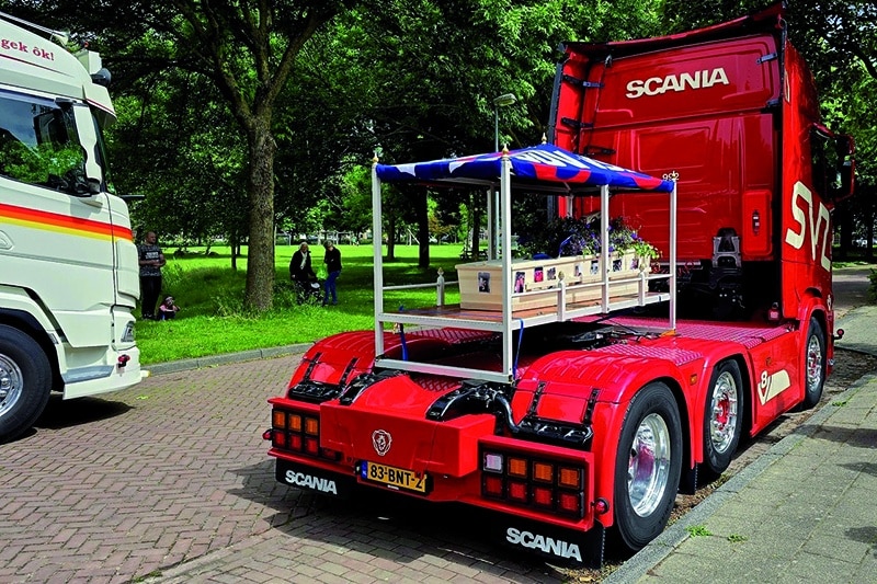 Geen elektrische rouwautoDanny: “Al snel ontstond het idee om zijn kist met een vrachtwagen weg te brengen. We wilden geen elektrische rouwauto. Dat had Sven niks gevonden. Ik had zelf net een nieuwe DAF. Ik dacht: ‘Dat ga ik hem niet aandoen. De kist moet op de Scania V8’. Dat vonden ze bij SVZ meteen goed. De sleepauto, de V8 en mijn eigen vrachtwagen, dat was het plan. Zo konden we met zijn familieleden, waarvan er meerdere een vrachtwagenrijbewijs hebben, Sven zelf wegbrengen. We mochten zelfs een vrachtwagen van SVZ lenen, zodat het hele gezin met Sven kon meerijden.” Casper: “En toen vroeg de ene na de andere chauffeur ‘mogen we meerijden’. Ook klasgenoten van Sven. En zo werden het twintig vrachtwagens.”