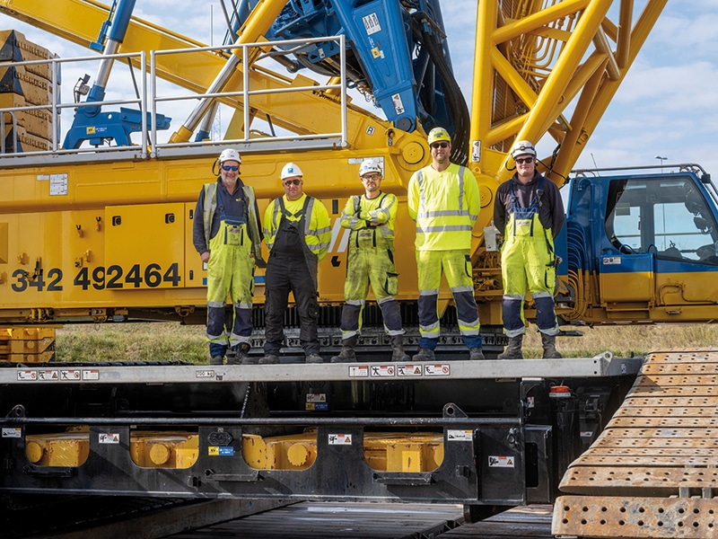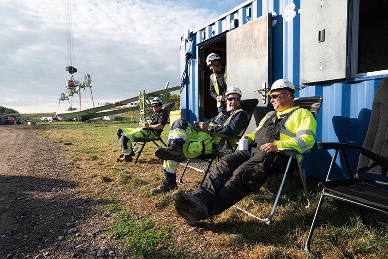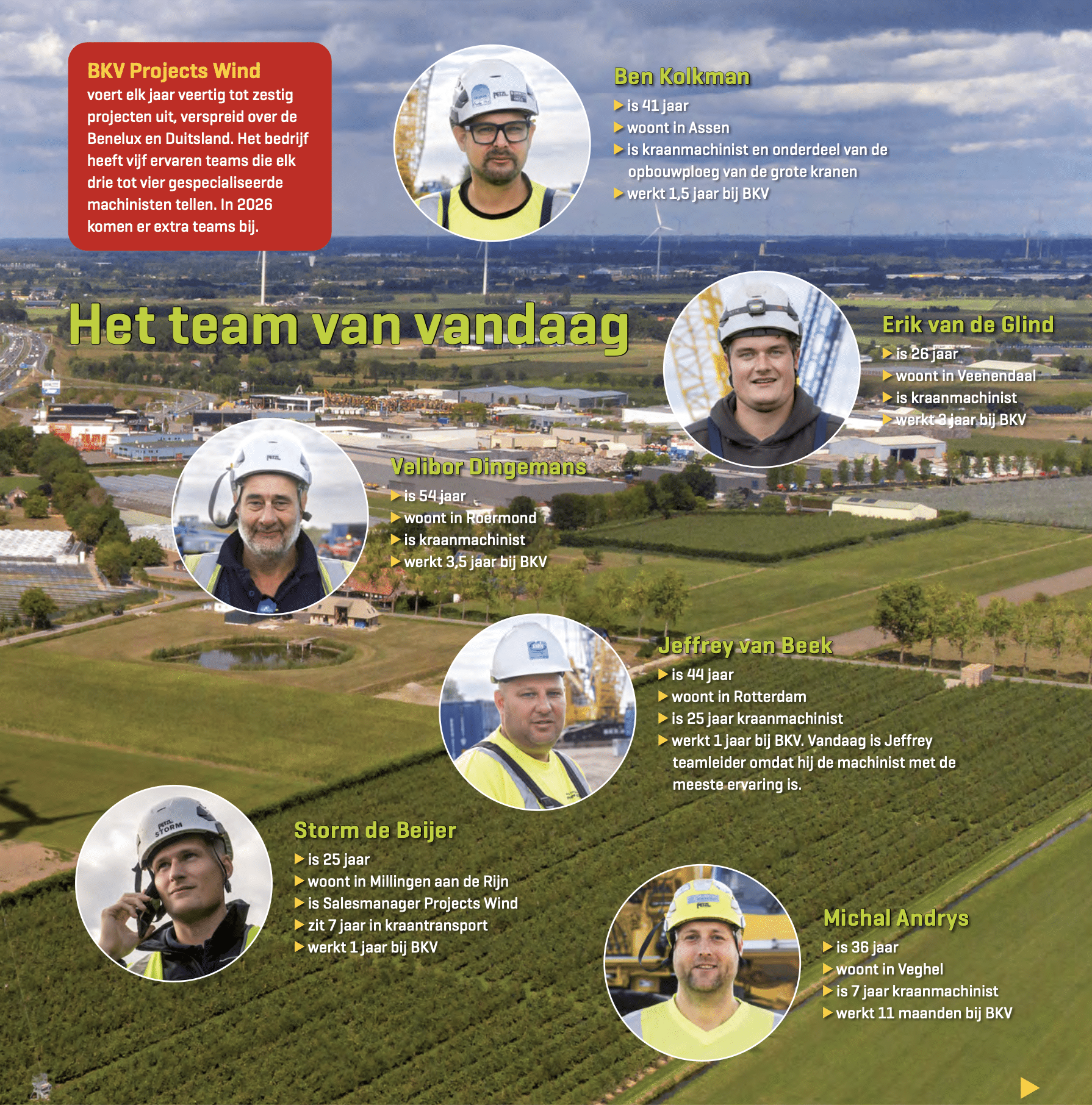 Kraanwerk is teamwerk. De kraanmachinisten moeten op elkaar kunnen vertrouwen. Ze werken meestal in vaste teams. Ze bouwen nieuwe windturbines op en doen daarnaast onderhoud en de afbouw van windturbines. Hun werkgebied is de Benelux en Duitsland. Kraanmachinist Erik van de Glind: “Afgelopen winter hebben we vier heel grote windturbines in Duitsland, bij de Poolse grens, geplaatst. We waren daar viereneenhalve maand aan het werk.”