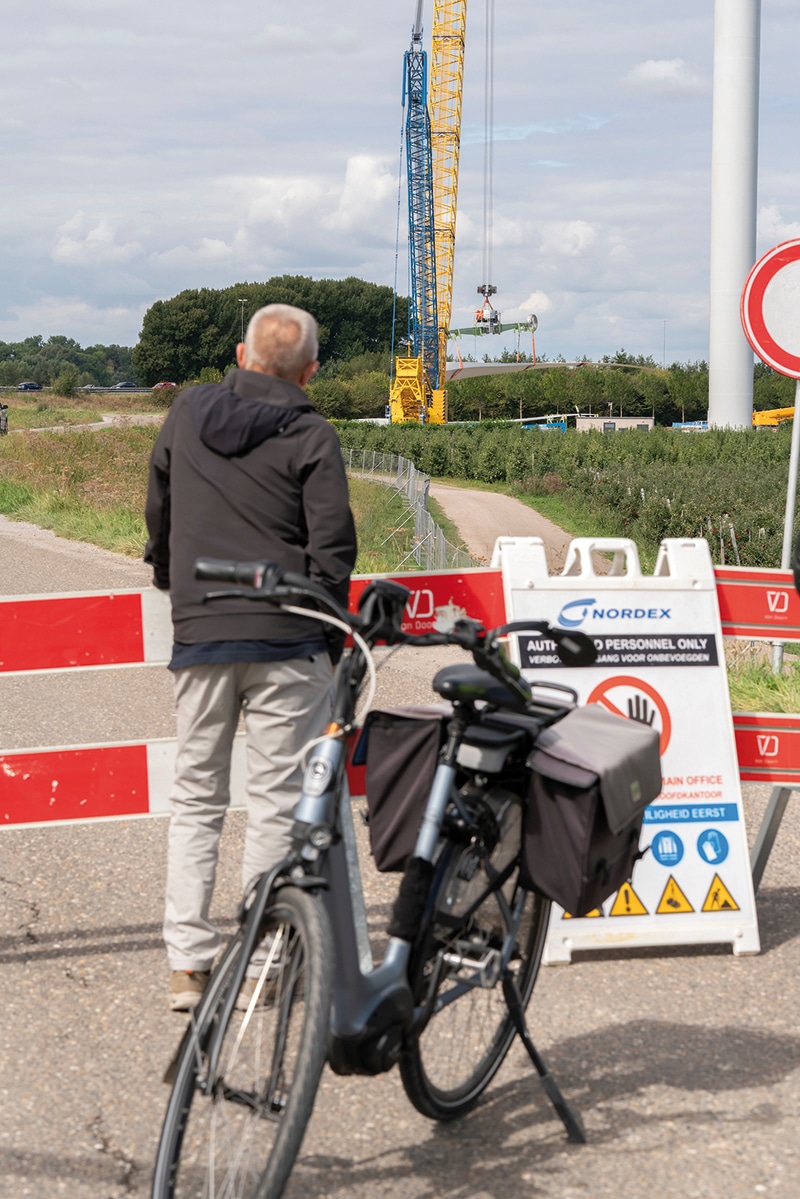 Na de bijeenkomst vertelt kraanmachinist Erik van de Glind dat vorige week donderdag de turngear kapot bleek te zijn: het onderdeel waardoor de bladen van de windturbine kunnen draaien. “Daardoor konden we twee bladen niet monteren. We wachten nu tot dit onderdeel er is. Zodra de turngear is bevestigd, gaan wij de bladen hijsen. Daarna leggen we de kraan plat.” Het afbreken van de kraan is nodig om hem te kunnen verplaatsen naar de plek waar de tweede windturbine komt te staan.