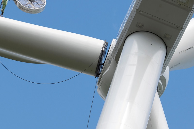 Michal krijgt van de Nordex-medewerkers in de windturbine het sein om te hijsen. Drie kwartier later is de klus geklaard. Het blad is bevestigd. “Het geluid dat je nu hoort is het aandraaien van de bouten”, legt Erik uit. “Torquen noemen we dat. Het klinkt als een grote specht.”