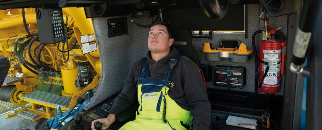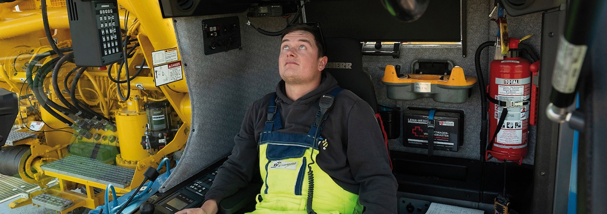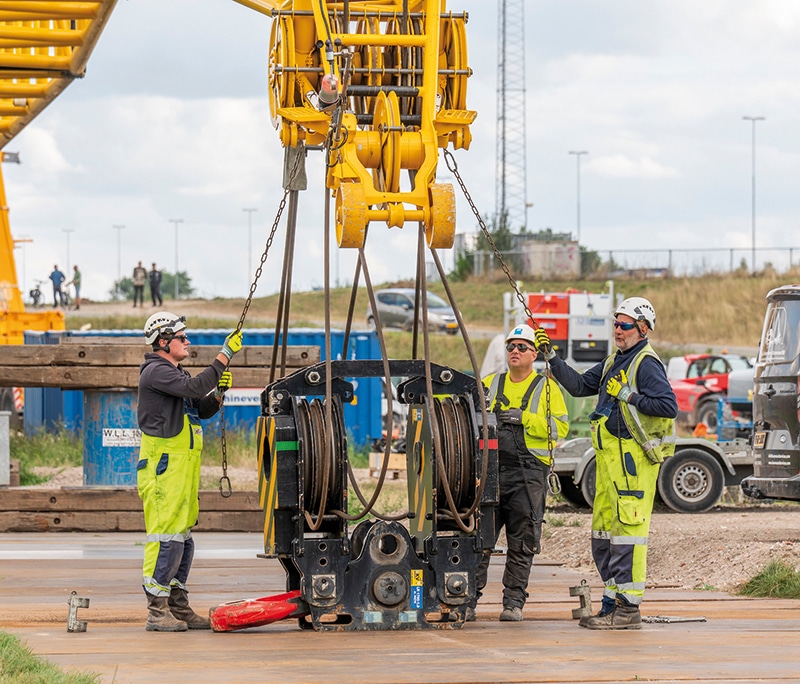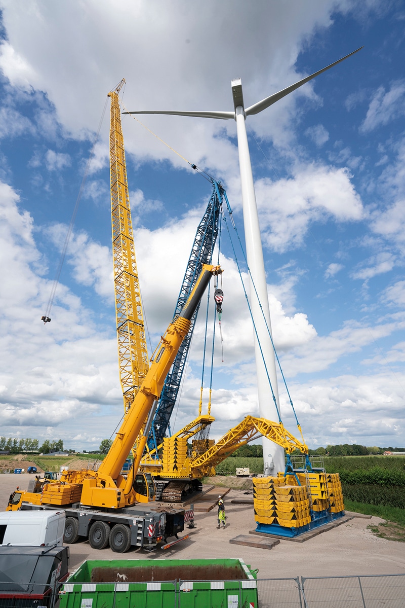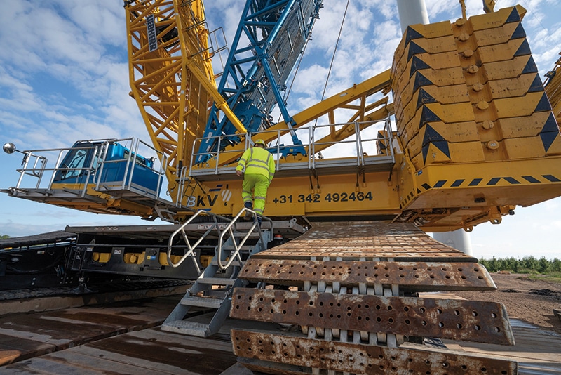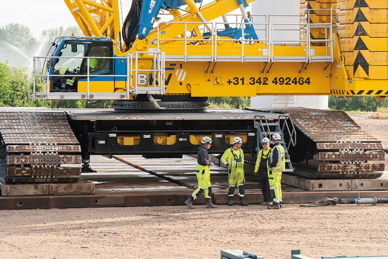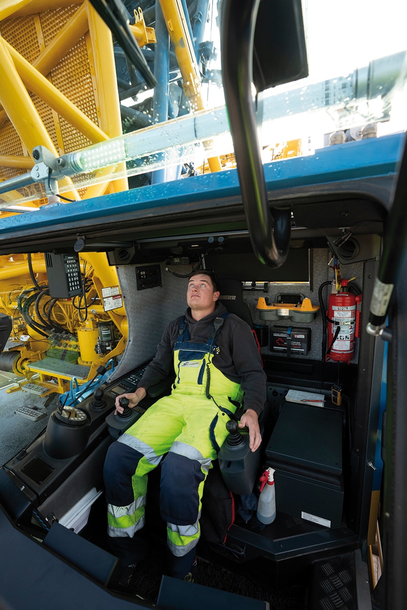 Op de site van de eerste windturbine staat de vaste kraan, naast de toren van de windturbine. Het is een LR 1700. De kraan op rupswielen staat op een plateau van stalen platen om verzakking van de kraan te voorkomen. Erik: “De ondergrond is hier erg zacht. En de kraan weegt met ballast erbij zo’n duizend ton.” De jonge machinist weet veel van de kraan: “Het maximale hijsvermogen is 700 ton. De kraan heeft een maximale hijshoogte van 198 meter en een reikwijdte van 160 meter.” Erik heeft na zijn hijsopleiding van vier weken een jaar meegelopen met een BKV-leermeester. “Ik was automonteur en maakte drie jaar geleden de overstap naar BKV. Ik kan nog veel leren van mijn collega’s.”