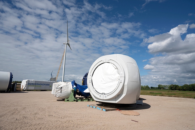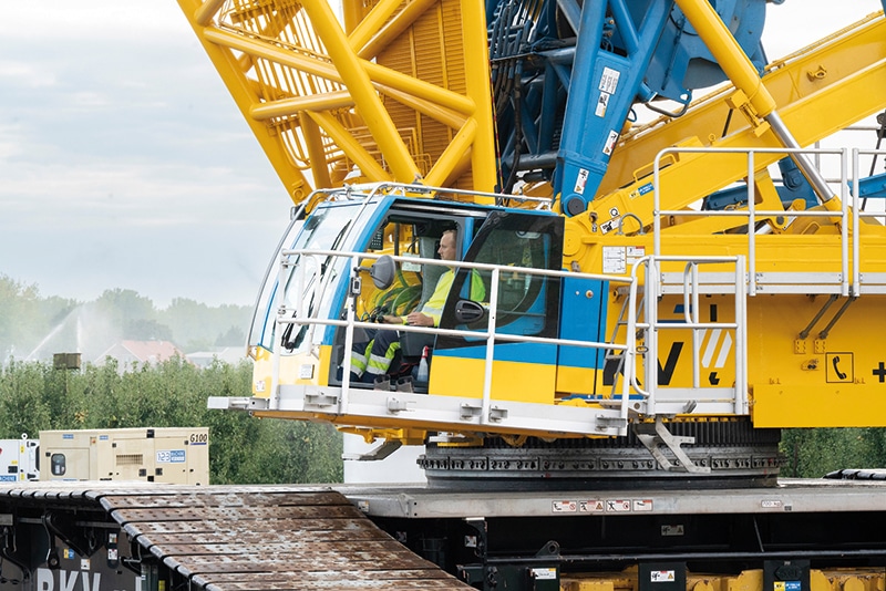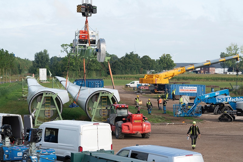 De bladen van de windturbine liggen op lichtgroene stellages. Er is ook een 250-tons mobiele kraan. Deze kraan wordt gebruikt voor de opbouw van de rupskraan en ander voorbereidend werk. Onderling bepalen de kraanmachinisten wie er vandaag in de rupskraan gaat hijsen. “Soms heb je zin om te hijsen. En op een andere dag heb je meer zin om grondwerk te doen”, vertelt Michal Andrys. “Vandaag zit ik op de grote kraan.” Voor hij in de kraan stapt, trekt hij zijn laarzen uit. Het hoogpolige tapijt in de cabine wil hij graag schoonhouden. Dan hijst hij de liftingtool op.