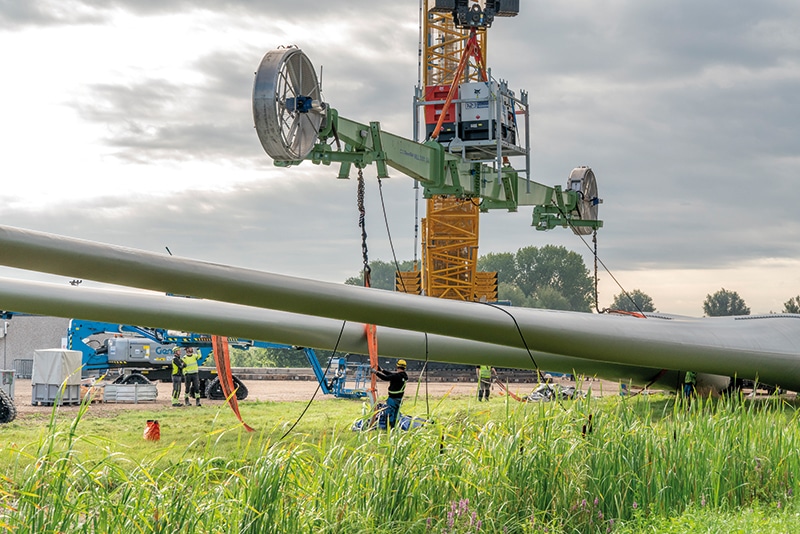 De medewerkers van Nordex en Art Wind bevestigen de liftingtool met aan weerszijden een ventilator, aan een van de bladen. Het grote lichtgroene gevaarte wordt met een speciaal kliksysteem vastgemaakt aan het blad. “Met dit systeem besturen we het rotorblad als we aan het hijsen zijn”, vertelt Storm de Beijer, Salesmanager Wind bij BKV.