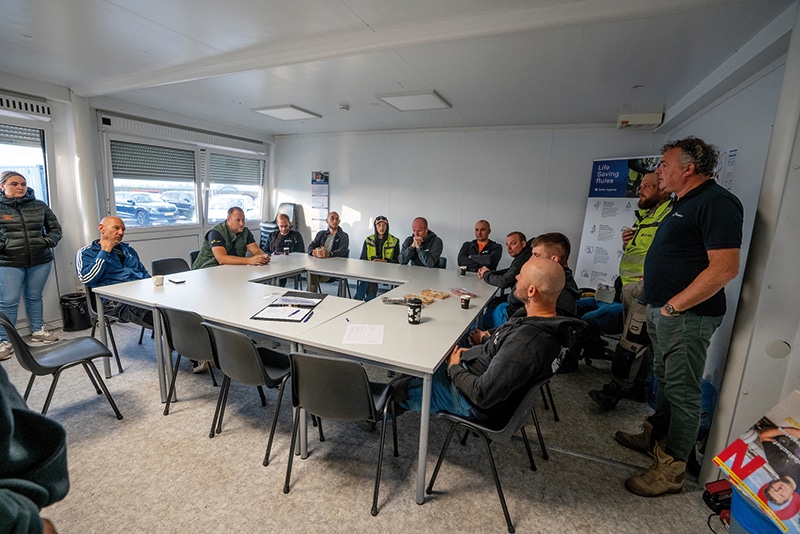 Bij Nordex in Velddriel verzamelen medewerkers van Nordex, Art Wind en BKV zich in de kantine voor de dagelijkse toolboxmeeting. Ze tekenen de presentielijst. Sitemanager Harald Peters van Nordex legt in het Engels de werkzaamheden uit.