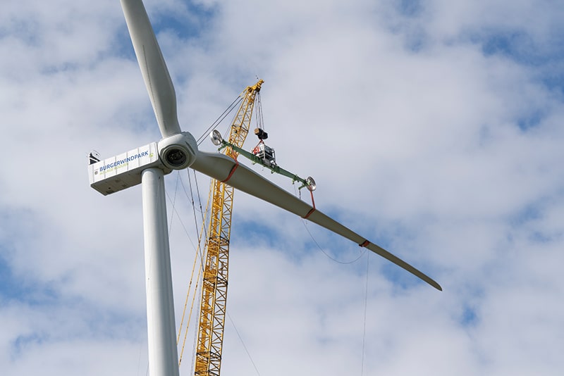 Vlak naast de A2 bij Velddriel staat een windturbine met één blad fier overeind. De kraanmachinisten van BKV Projects Wind staana klaar om de resterende twee vleugels van de turbine te monteren. Het is de eerste turbine van het Burger Windpark. In dit kleine windmolenpark langs de snelweg komen drie windturbines van windmolenfabrikant Nordex te staan.