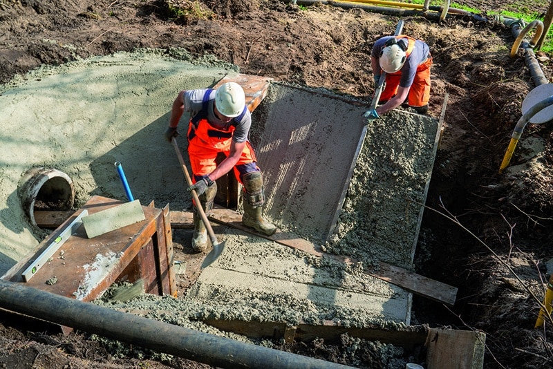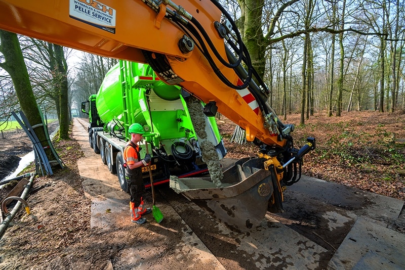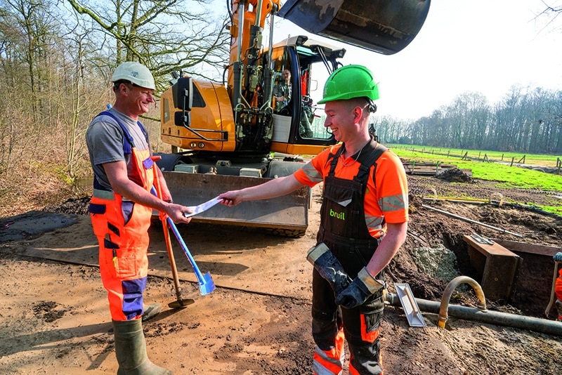Over smalle weggetjes rijdt Youri naar Almen. In de verte is de keet van de weg- en waterbouwers al te zien. “Ik heb nu maar 4,5 kuub beton geladen”, vertelt Youri. “Daar merk ik niets van tijdens het rijden.” Hij rijdt zijn wagen achteruit naar de werkplek. De graafmachine staat klaar naast een sloot om het beton lading voor lading in zijn graafbak op te vangen en daarna bij de stuwconstructie te lossen. Hier wordt met beton een vaste constructie gemaakt, een betonnen muur in de sloot. Twee inframannen, medewerkers van het weg- en waterbouwbedrijf, staan in het gat dat ze gegraven hebben. Ze geven de machinist aanwijzingen waar hij het beton moet storten. Geroutineerd en snel verspreiden ze het beton tegen de aarden wal. Youri pakt een borstel en verwijdert de spetters beton van zijn stootbalk.