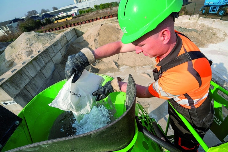 Drie betonmixers staan te wachten om beton te laden voor de hal van de bedrijfshal in Vorden. Youri mag tussendoor laden voor het weg- en waterbouwbedrijf. Na het laden zet Youri zijn mixer stil en klimt naar boven om een paar zakken met witte kunstvezels aan het betonmengsel toe te voegen. Daarna zet hij de mixer weer aan om alles goed te mengen en spuit hij zijn wagen schoon.