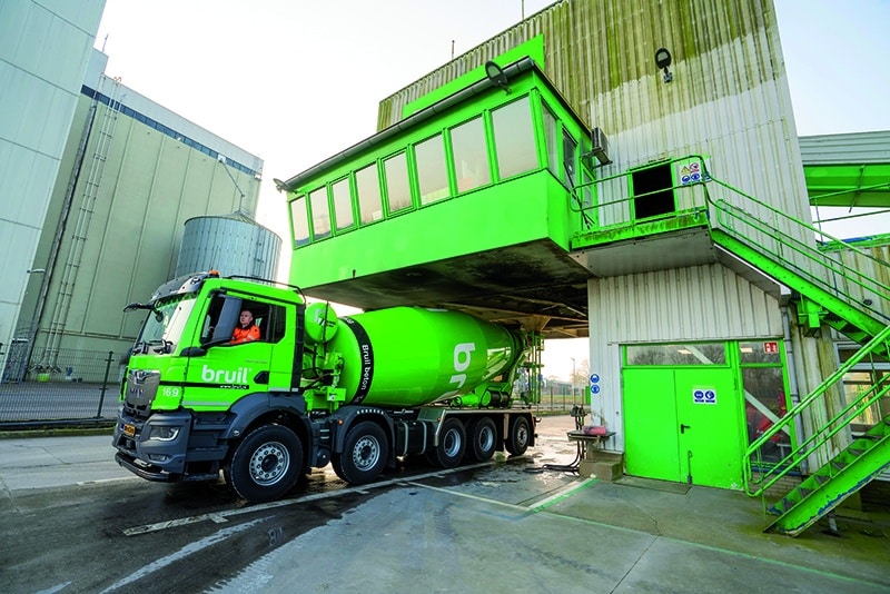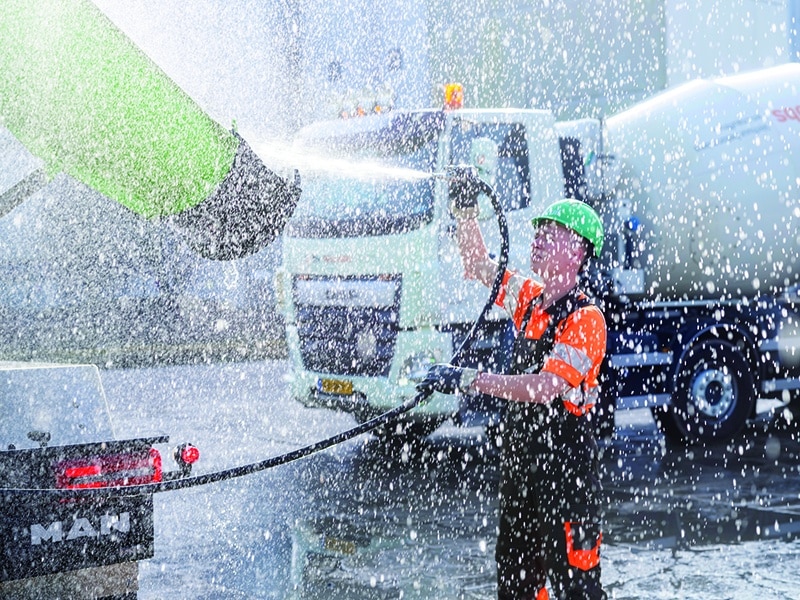 Youri spoelt zijn wagen schoon, terwijl collega’s achteruit naar de giekpomp rijden om te lossen. “Met beton moet je doorwerken,” zegt Youri. “Ik verwacht dat de 325 kuub beton er voor elf uur in ligt.” Met een lege wagen rijdt Youri terug naar Lochem. Zijn betonmixer is negen weken oud. “Het is mijn vaste wagen. Ik ben er erg netjes op. Vrijdag heb ik hem nog helemaal schoongemaakt. Bij Bruil gaan we nooit naar een wasstraat. We wassen onze eigen auto’s.”