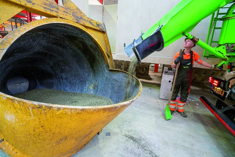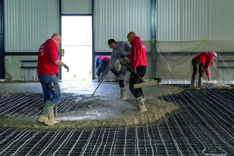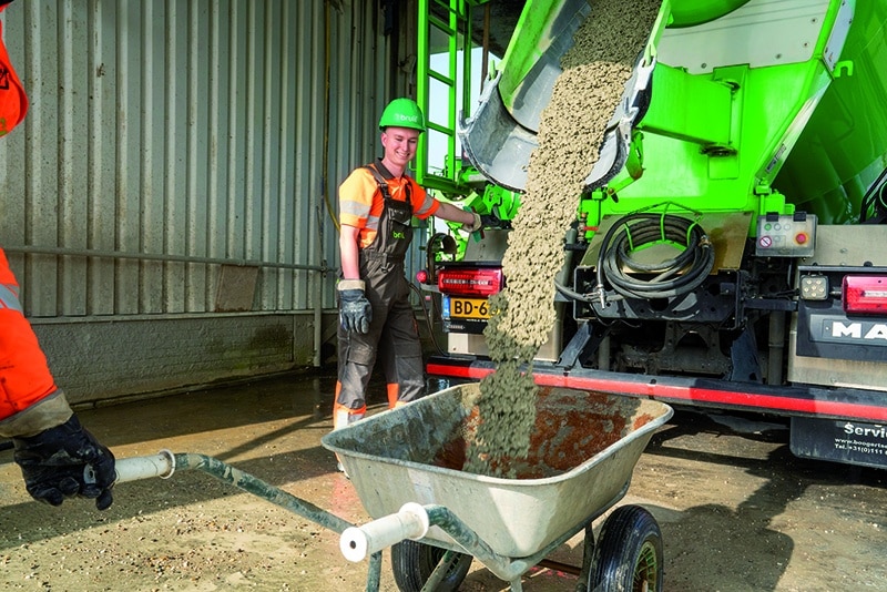 Vandaag staat er 325 kuub beton gepland voor de vloer van een bedrijfspand in Vorden: goed voor zo’n 25 vrachtwagenladingen. Sinds 6.30 uur rijden zeven betonmixers af en aan. Chauffeur Youri Broekman is een van hen. “Ik begin meestal tussen half zes en half zeven. Als het mooi weer is, ga ik op de fiets naar de betoncentrale in Lochem. Dat is een halfuur fietsen.” In het kantoor, boven de laadplaats, staat mengmeester Erik van Ark. Hij zorgt dat elke klant het juiste betonmengsel krijgt: “Er zijn honderden verschillende recepten voor beton.” Erik bedient de menginstallatie, controleert de grondstoffen, belaadt de betonmixers en waakt over de kwaliteit en planning. Op een computerscherm volgt hij zijn collega’s.