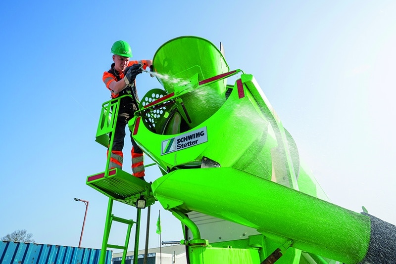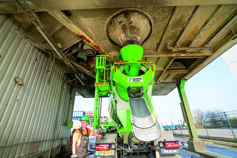Youri draait zijn wagen en rijdt achteruit naar de overdekte stortkoker. Met een druk op de knop start het laden. Het beton stroomt in de vulopening. Binnen tien minuten is de betonmixer vol. Daarna klimt hij de trap op naar het kantoor van de mengmeester om de laadbrief te halen. “Ik heb nu consistentieklasse F5 geladen. Dat is vloeibaar beton geschikt voor vloeren. Deze lading klotst meer. Ik pas mijn rijstijl daarop aan.” Youri rijdt zijn wagen naar de zijkant van het terrein. Razendsnel schuift hij aan de achterkant van de betonmixer een trap uit en klimt naar boven. “Ik spuit nu alles schoon. Als je het beton laat zitten, hardt het uit en krijg je het niet meer schoon. Dat doe ik elke keer na laden en lossen.” Ondertussen staat er alweer een collega te laden en komt er een derde betonmixer aangereden.