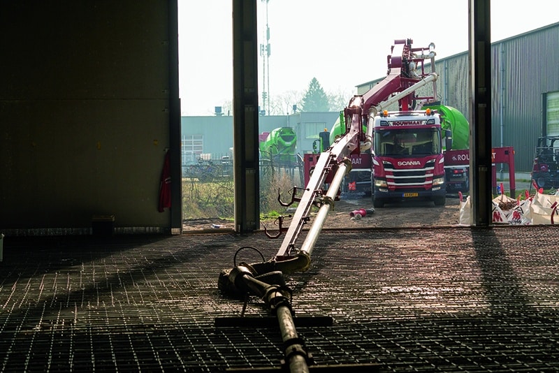 Van Lochem naar de bedrijfshal in Vorden is een ritje van een kwartier. Voor de bedrijfshal staat een giekpomp op vier stempels. Deze pomp met flexibele uitschuifbare arm transporteert het beton naar moeilijk bereikbare plekken. De mannen van Hengeveld Bedrijfsvloeren en Rouwmaat Groep zijn hier aan het werk. Een collega staat met zijn betonmixer naast de wagen van Youri. Ze lossen hun lading tegelijkertijd. Youri haalt een zwarte hendel om en het vloeibare grijze beton verdwijnt in de stortbak van de giekpomp. In een hoek van de hal komt het beton uit de slang aan het einde van de giek. De mannen van Hengeveld spuiten het beton in de bekisting. Daarna maken ze het beton vlak met een rij: een lange rechte lat. De giekpomp laat af en toe harde knallen horen. Het lossen van veertienduizend liter beton duurt 10 minuten.